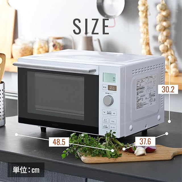【商品仕様】本体サイズ:幅48.5×奥行37.6×高さ30.2cm、本体重量:15.3kg、庫内サイズ:幅28.3×奥行32.2×高さ約19.2cm、庫内容量:18L、電源コードの長さ:約1.5m、電源: AC100V(50/60Hz共用)、消費電力:[レンジ=900/1250W(50/60Hz)][オーブン=1380W(温度調節:35・40℃(発酵)、100~250℃)][グリル=820W]、レンジ高周波出力:650W(60Hzのみ)/500W/200W、期間:お買い上げ日より1年間(の範囲については、取扱説明書をご確認ください。(一般家庭用以外(業務用など)に使用された場合の故障及び損傷などは対象外となります))