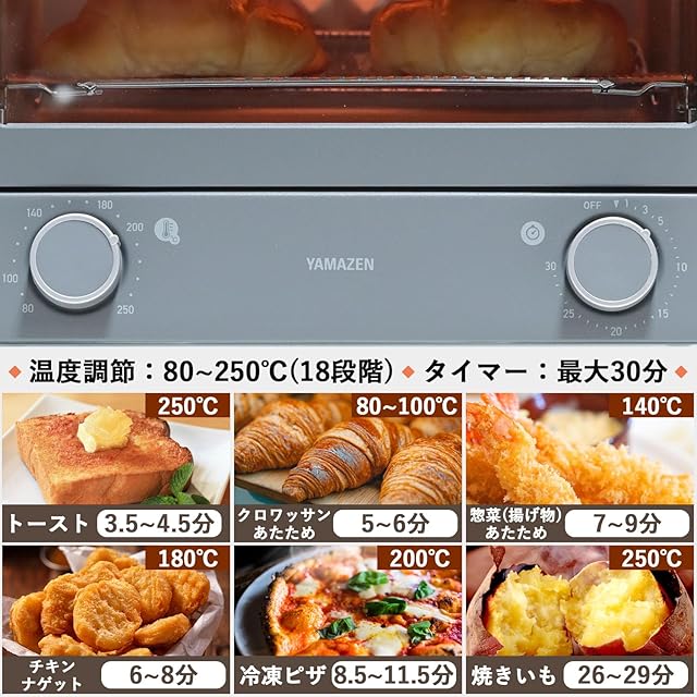 【食材に合わせた温度と調理時間】最大30分まで設定できるタイマー機能、さらに80~250度まで設定できる温度調節機能搭載。食パンはもちろん、とろーりチーズのピザにこんがりお餅など食材に合わせてお好みで設定してください。