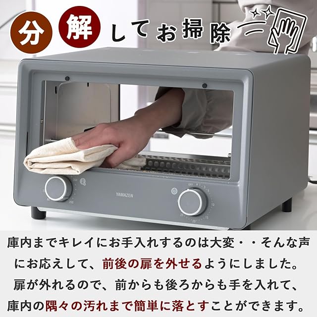 【分解できてお手入れラクラク】オーブントースターは焼き網やパンくずトレーなどは簡単にお手入れできても、庫内まではキレイにするのは難しい、そんな声にお応えして、取り外し可能な前扉と開閉式の背面扉(特許取得済み)を採用しました。扉が外れるので、前からも後ろからも手を入れて、庫内の隅々の汚れまで簡単に落とすことができます。