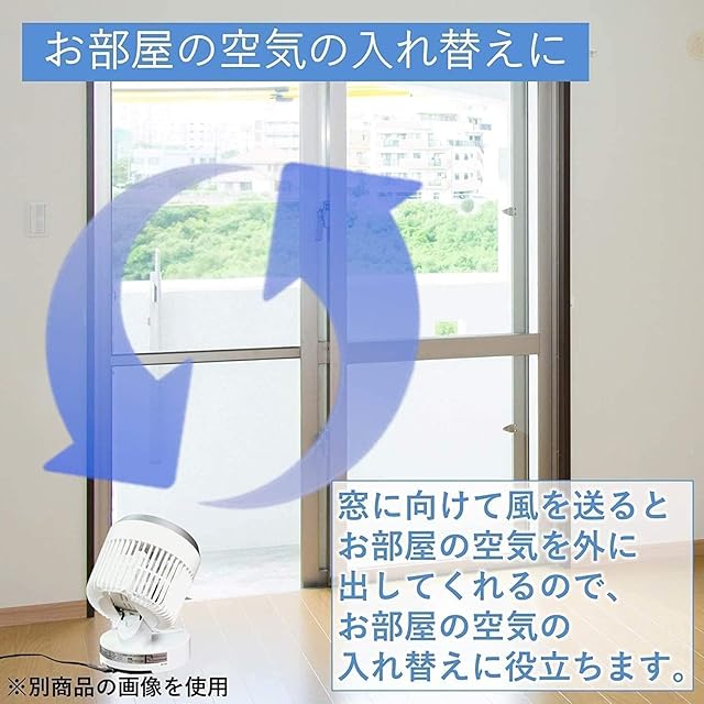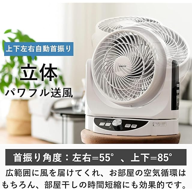 【首振り】上下左右に自動で首振りする立体首振り機能搭載。左右合計55度、上向き85度までの首振りでお部屋全体に風を届けます。さらに、直進性が強いパワフル送風で30畳まで対応。より遠くまで風を届け、お部屋の空気循環や換気をサポートします。