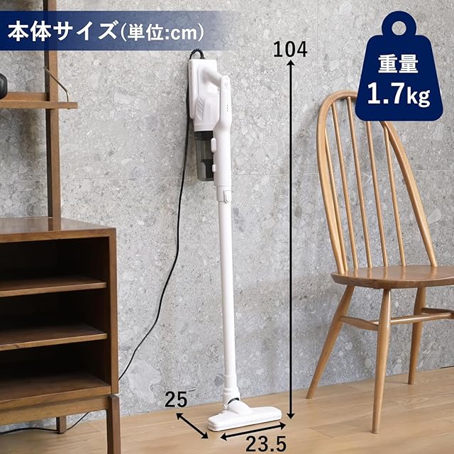 【商品仕様】▪本体サイズ:幅10×奥行16.7×高さ41cm/スティック装着時:幅23.5×奥行25×高さ104cm ▪重量:1.7kg ▪電源コードの長さ:4m ▪集じん容量:0.5L ▪定格電力:AC100V 50Hz/60Hz ▪消費電力:600W ▪吸引仕事率:110W ▪付属品:すき間ノズル、フロアノズル、延長管 ▪期間:お買い上げ日より1年間(の範囲については、取扱説明書をご確認ください。(一般家庭用以外(業務用など)に使用された場合の故障及び損傷などは対象外となります))