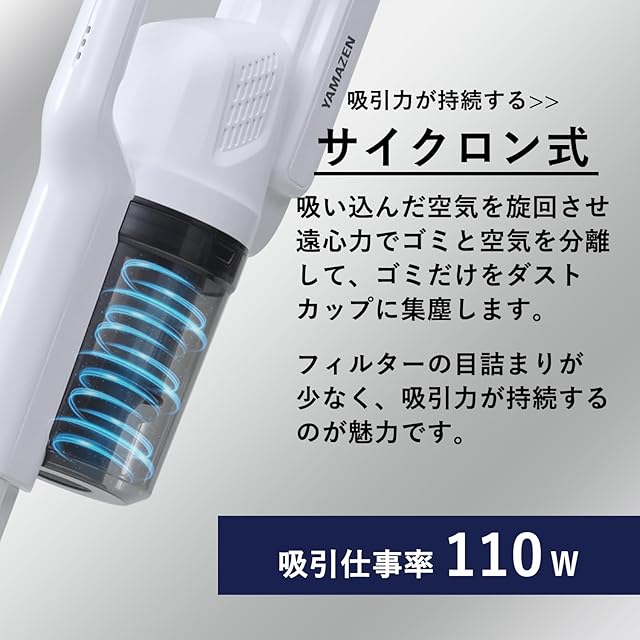 【抜群の吸引力】軽量なのに吸い込みは抜群の吸引仕事率110W。フィルターの目詰まりが少なく、吸引力が長続きするサイクロン式で吸い込んだ空気を旋回させ、遠心力でゴミと空気を分離して、ゴミだけをダストカップに集塵します。