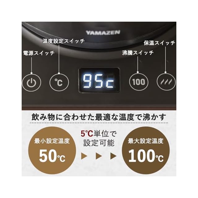 【温度調節】50℃~100℃を5℃単位で温度調整が可能です。飲み物に合わせた温度でお湯を沸かすことができ、無駄な温めすぎを防ぐので、省エネにも繋がります。沸騰スイッチを押せばワンタッチでの沸騰も可能です。