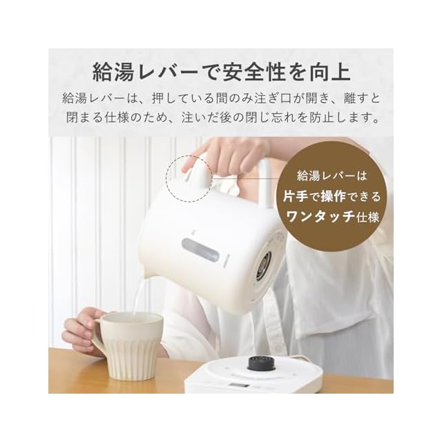 【“片手ワンタッチ”仕様】「給湯レバー」を取っ手側に取り付けることで、注ぎ口の開閉を片手で操作することができます。一般的な電気ケトルは、フタ上部のボタンで注ぎ口を開いた後に注ぐ2アクション仕様となっているため、その手間を省いた“片手ワンタッチ”仕様で利便性を向上させました。