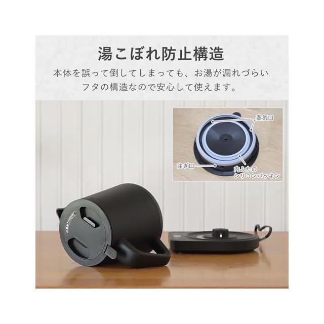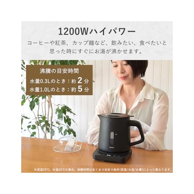 【1200Wハイパワー】1200Wのハイパワーで満水時(1L)でも約5分でお湯が沸かせ、コーヒーや紅茶など、飲みたいと思ったときにすぐお湯を沸かしてくれます。容量も1Lと大容量なので、家族みんなでのティータイムなどにも役立ちます。※沸騰時間は目安で、条件(室温・水温等)によって異なります。