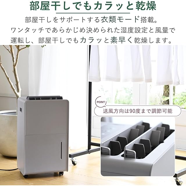 【衣類モード】部屋干しをサポートする衣類モード搭載。ワンタッチであらかじめ決められた湿度設定と風量で運転し、部屋干しでもカラッと素早く乾燥します。また、ルーバーが2箇所設置されているので、洗濯物に風があたりやすく衣類などを効率的に乾燥でき、送風方向も90度まで調節できるので、ピンポイントで洗濯物に風を当てることも可能です。