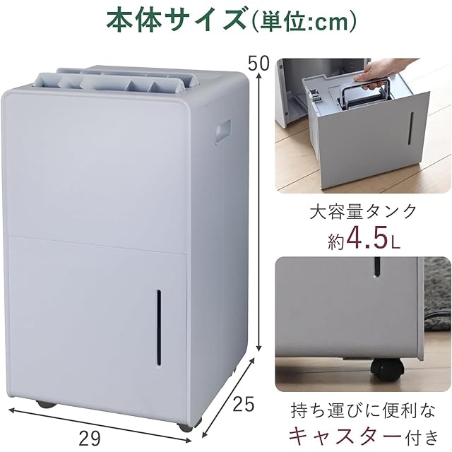 【除湿機能】▪除湿面積の目安:木造12畳/プレハブ20畳/鉄筋25畳(50Hz)、木造14畳/プレハブ22畳/鉄筋28畳(60Hz) ▪タンク容量:約4.5L ▪除湿方法:コンプレッサー式 ▪定格除湿能力:10.0L/日(50Hz)、12.0L/日(60Hz)