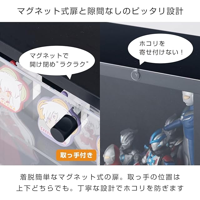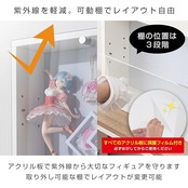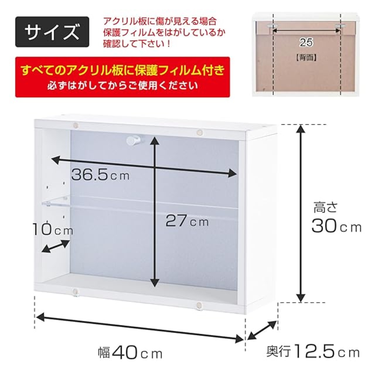 部材:BOX部(MDF+メラミンシート)/背面フェルト張り+EPE(発泡ポリスチレン)仕様(MDF)/扉部(3mmアクリル)/可動棚板(4mmアクリル)