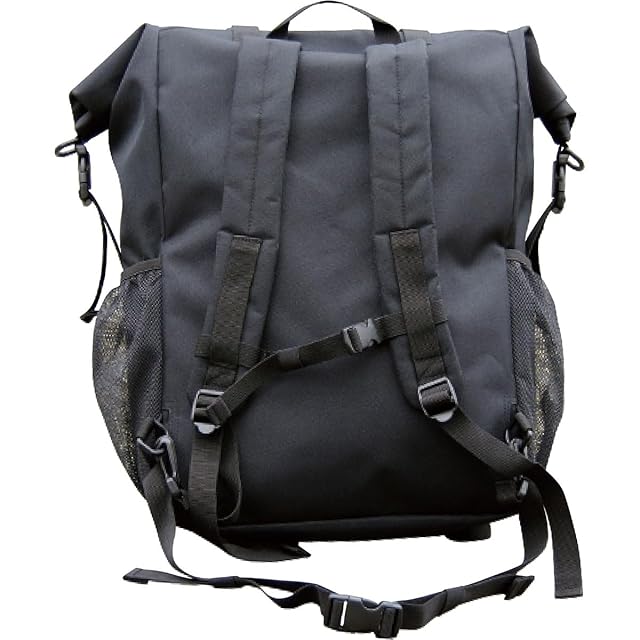 防水仕様の大容量バックパックショルダーストラップとウエストベルトを収納。