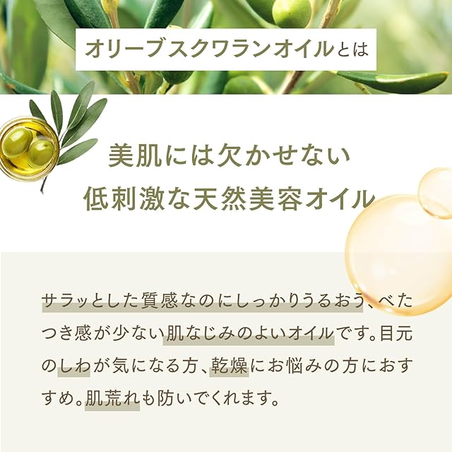 【オリーブスクワランオイルとは】オリーブスクワランオイルはサラッとした質感なのにしっかりうるおい、べたつき感が少ない肌なじみのよいオイルです。目元のしわが気になる方、乾燥にお悩みの方におすすめです。