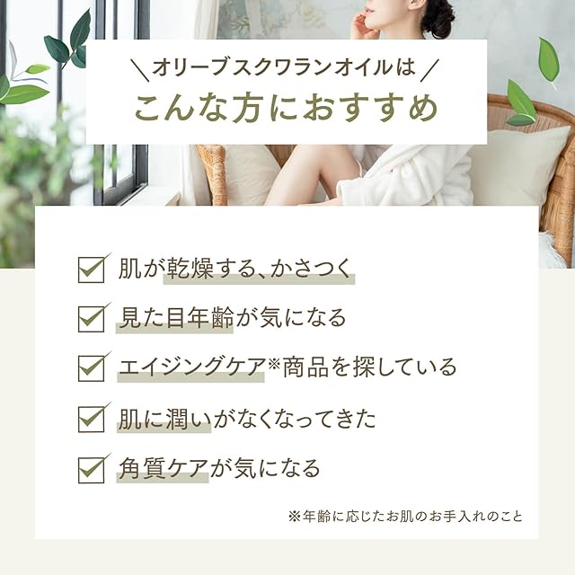 【天然100%オリーブスクワランオイル】100%天然由来の成分にこだわったオリーブスクワランオイル。オリーブスクワランオイルは、減っていく天然美肌成分スクワランを手軽にチャージできるオイルです。天然美肌成分と呼ばれるスクワランは、肌の皮脂成分の1つで保湿効果やエモリエント効果があります。しかし25歳頃から急激に減っていくと言われているため、オリーブスクワランオイルはエイジングケア※に最適です。