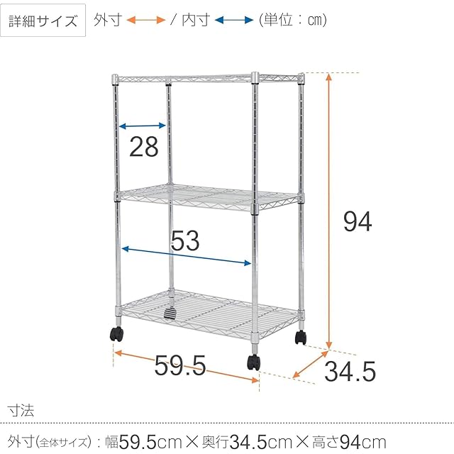 本体サイズ(約):幅59.5×奥行34.5×高94cm(棚板有効内寸:幅53×奥行28cm)