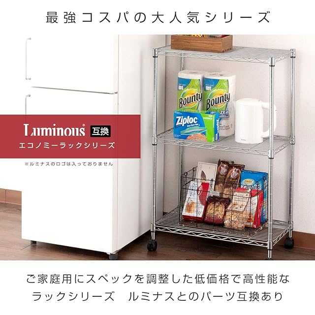 商品名:ドウシシャ メタルルミナスラック キャスター付き スチールラック幅60 3段 EL19-90603 軽量で組立簡単工具いらず 幅59.5×奥行き34.5×高さ94.0cm 棚板耐荷重80kg 全体耐荷重240kg 頑丈 防錆加工 ポール径19mmパーツ対応 キッチンラック 隙間収納