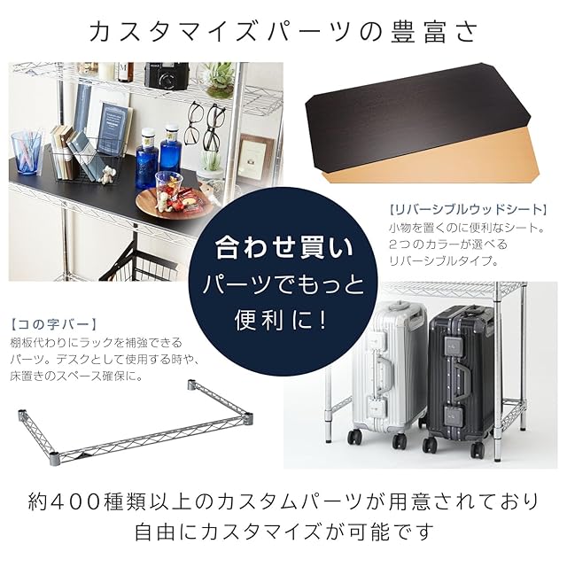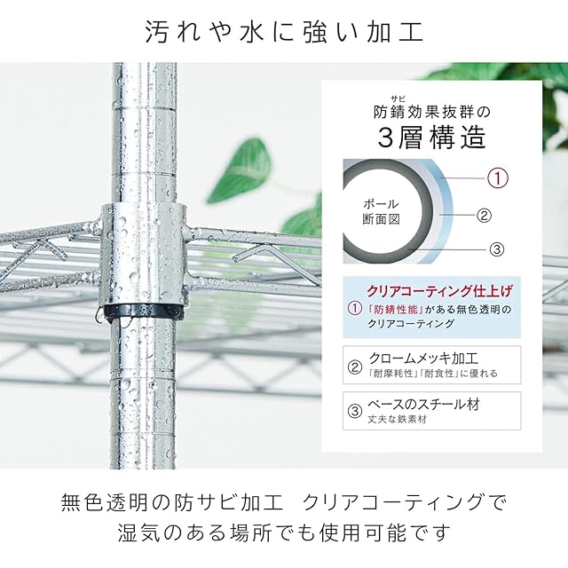 素材:シェルフ(棚)・ポール:スチール(クロームメッキ)、スリーブ:ABS樹脂