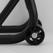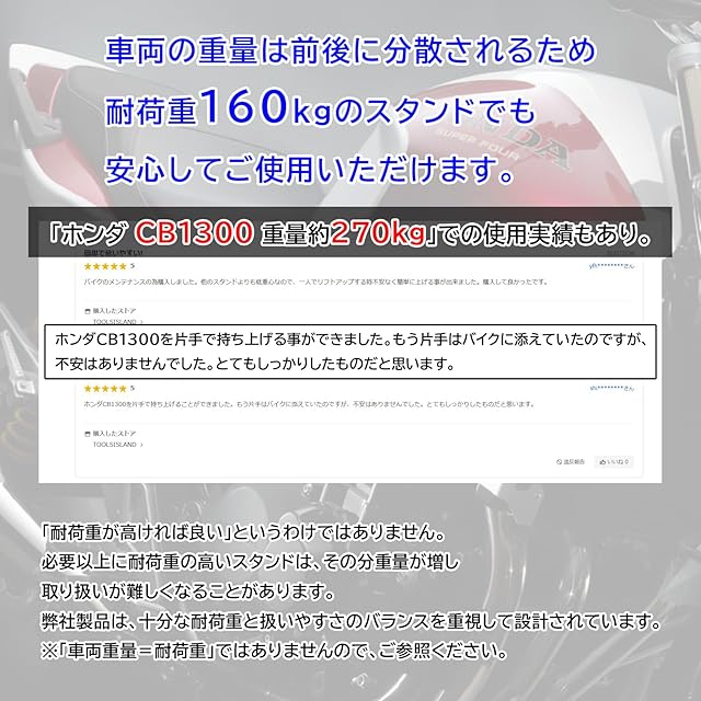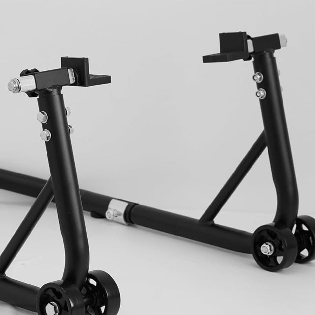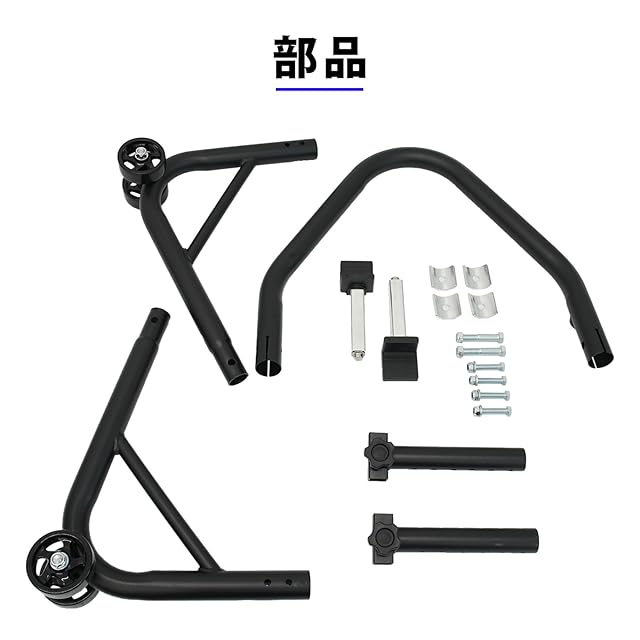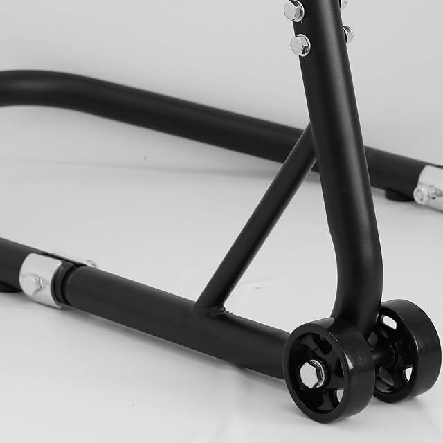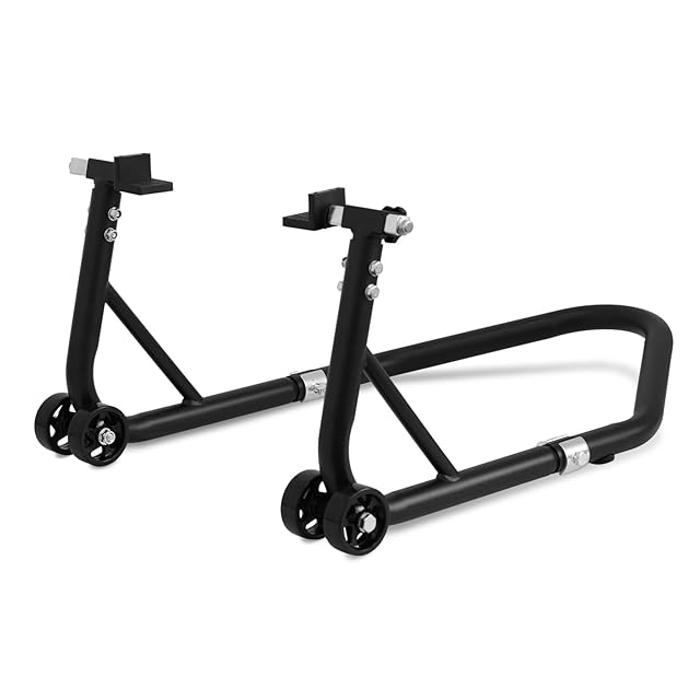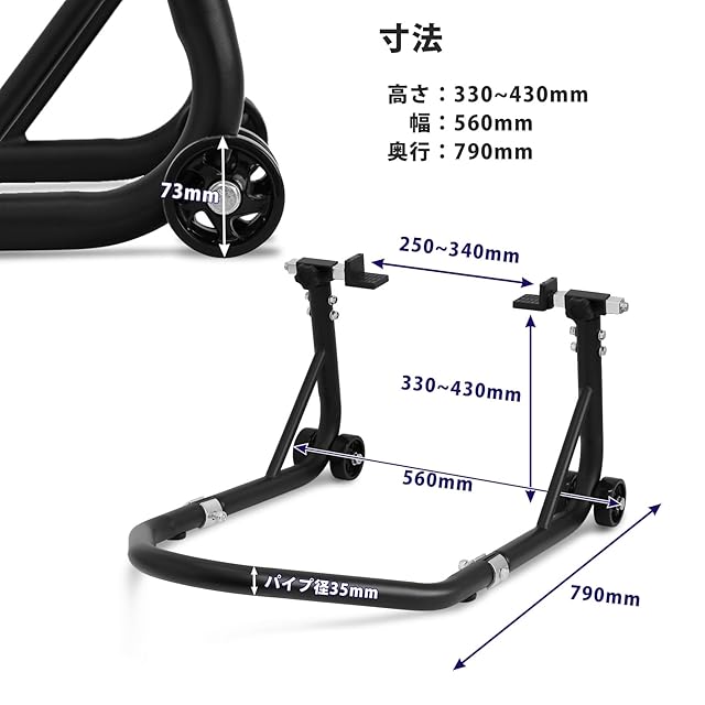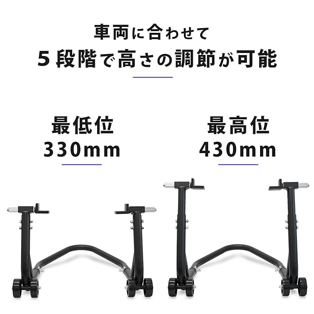 【商品詳細】<br> 5段階で高さ調整が可能で様々な車両に対応、メンテナンスする際、必要に応じて高く調整出来ます。<br> <br> 【組み立てが簡単、使用範囲が広い】<br> 組み立てにはスパナかメガネレンチが必要、スイングアーム幅に合わせて調節可能です。<br> パイプサイズは35mmで耐久性も抜群!<br> リア耐荷重は160kgで幅広い車両に適合!<br> 本体が地面に擦れる部分に保護パッドが付いているので、傷を防止できます。<br> 車輪付きで、オートバイを簡単に持ち上げることができます。<br> <br> 【特徴】<br> 高さは25mm刻みで5段階で調整が可能<br> スイングアーム幅は250~340mmの範囲で適合<br> 車輪サイズは73×26mm<br> 補強バーが付いていて、鉄製なので強度が抜群<br> 高級感漂うマッドブラック仕上げ<br> <br> 【仕様】<br> 製品サイズ:79×56×35cm<br> 適合スイングアーム幅:250~340(外側)mm<br> 耐荷重:160kg<br> 保持高さ:330から25mm刻みで5段階430mm<br> 材質:鉄製<br> 梱包サイズ:W51×D45×H12 cm<br> 梱包重量:6.4kg<br> 製品重量:5.6kg<br> <br> 【注意事項】<br> ※高さを必要以上に上げると、持ち上げ辛くなります。<br><br> ※説明書は付属しておりません。<br><br> ※こちらの商品は組立が必要な商品です。<br><br> ※手作業での採寸となりますので、若干の誤差が生じます。<br><br> ※製品仕様、使用方法を熟知してからご使用ください。<br><br> ※誤った使用方法により生じた、商品破損、人体への傷害、物品への損害、その他のいかなる損害に対しても、<br> 当社では一切の、並びに責務を負いかねますので、ご了承ください。<br><br> ※本製品はメンテナンス用品です。ディスプレイや保管用としてなど、本来の用途以外には使用しないでください。<br><br> ※使用する際は必ず、2名以上で作業を行なってください。<br><br> ※スイングアーム幅さえあえば中型も大型にも使用できます。<br><br> ※スイングアームが細く、車両重量が重い旧車などには使用する事が出来ません。<br><br> ※商品に関しまして、改善改良の為の予告無く仕様変更が行われる事があり、画像と違う場合がございますが使用に問題はございません。予めご了承ください。<br><br>