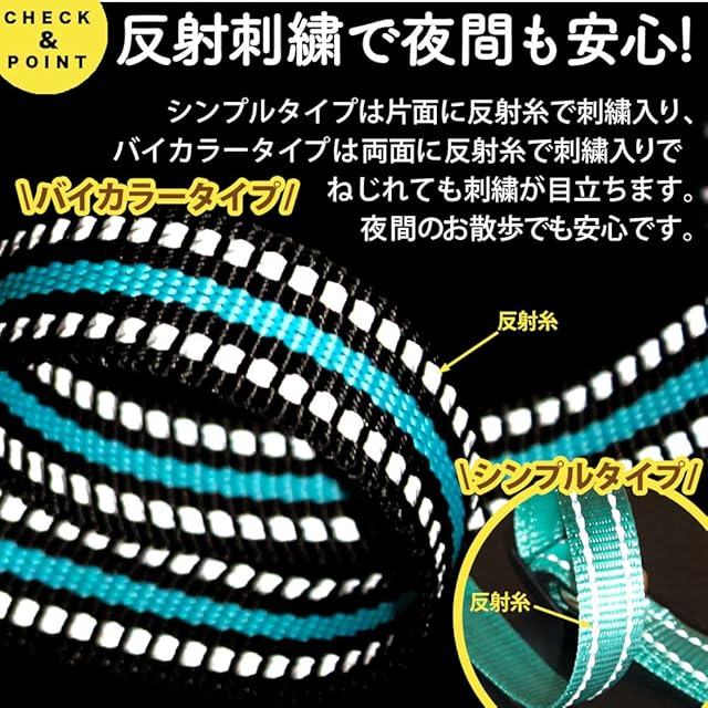 反射刺繍で夜間も安心です。シンプルタイプは片面に反射糸で刺繡入り、バイカラータイプは両面に反射糸で刺繍入りでねじれても刺繍が目立ちます。夜間のお散歩でも安心です。 3WAYで使えるからショルダーリード以外にも持ち手付きリードとしても、もう少し短いショルダーリードとしても使えます。またわんちゃんを車内で安全に係留したいときにも大活躍です。ワンタッチでヘッドレストへの装着が可能です。 肩にあたる部分は、約5.5cmと広めのパッド幅でふかふかに仕上げました。元気なわんちゃんにひっぱられても、クッションパッドで痛くなりにくい設計です。