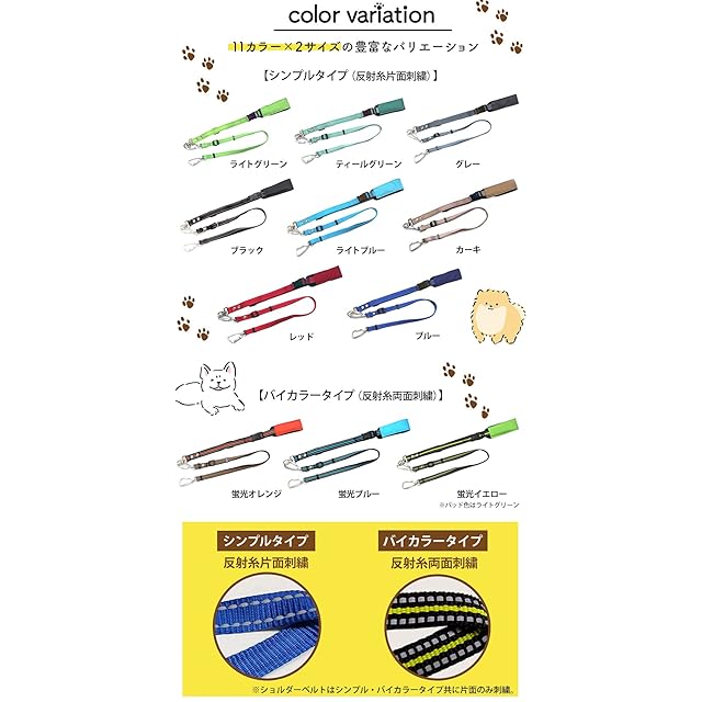 ■カラー:ブラック・カーキ・グレー・レッド・ブルー・ライトブルー・ティールグリーン・ライトグリーン・蛍光オレンジ・蛍光イエロー・蛍光ブルー ■サイズ:Sサイズ/リード幅約1.5cm、Mサイズ/リード幅約2.0cm ※以下共通 ■リード長さ/最短約80cm、最長約140cm、ショルダーベルト内周/最短約90cm、最長約140cm ■重量:Sサイズ/約230g、Mサイズ/約250g ■目安体重:Sサイズ/3-7kg前後の小型犬、Mサイズ/7-20kg前後の小型・中型犬 ■材質:ベルト/ナイロン、ショルダーパッド/オックスフォード生地、ポリエステル、カラビナ/アルミニウム、回転カン・Dカン/合金、アジャスター/プラスチック ■付属品:取扱説明書 ■製造国:中国