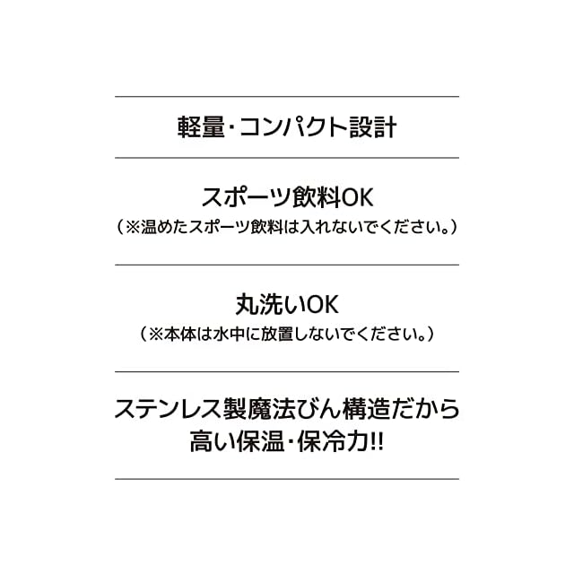 素材・材質:内びん/ステンレス鋼 、 胴部/ステンレス鋼(アクリル樹脂塗装) 、 フタ/飽和ポリエステル樹脂(発泡ポリプロピレン内蔵) 、 パッキン/シリコーンゴム
