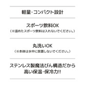 素材・材質:内びん/ステンレス鋼 、 胴部/ステンレス鋼(アクリル樹脂塗装) 、 フタ/飽和ポリエステル樹脂(発泡ポリプロピレン内蔵) 、 パッキン/シリコーンゴム