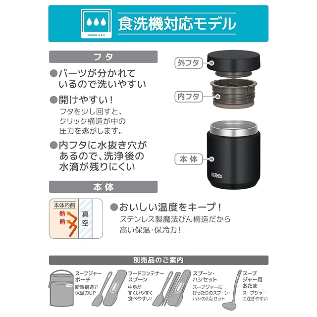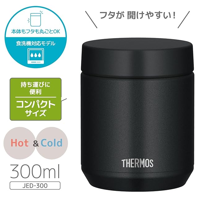 商品名:【食洗機対応モデル】 サーモス 真空断熱スープジャー 300ml ブラック 全パーツ食洗機OK 保温保冷 お手入れ簡単 口当たりがやさしい丸口設計 スタンダードモデル JED-300 BK