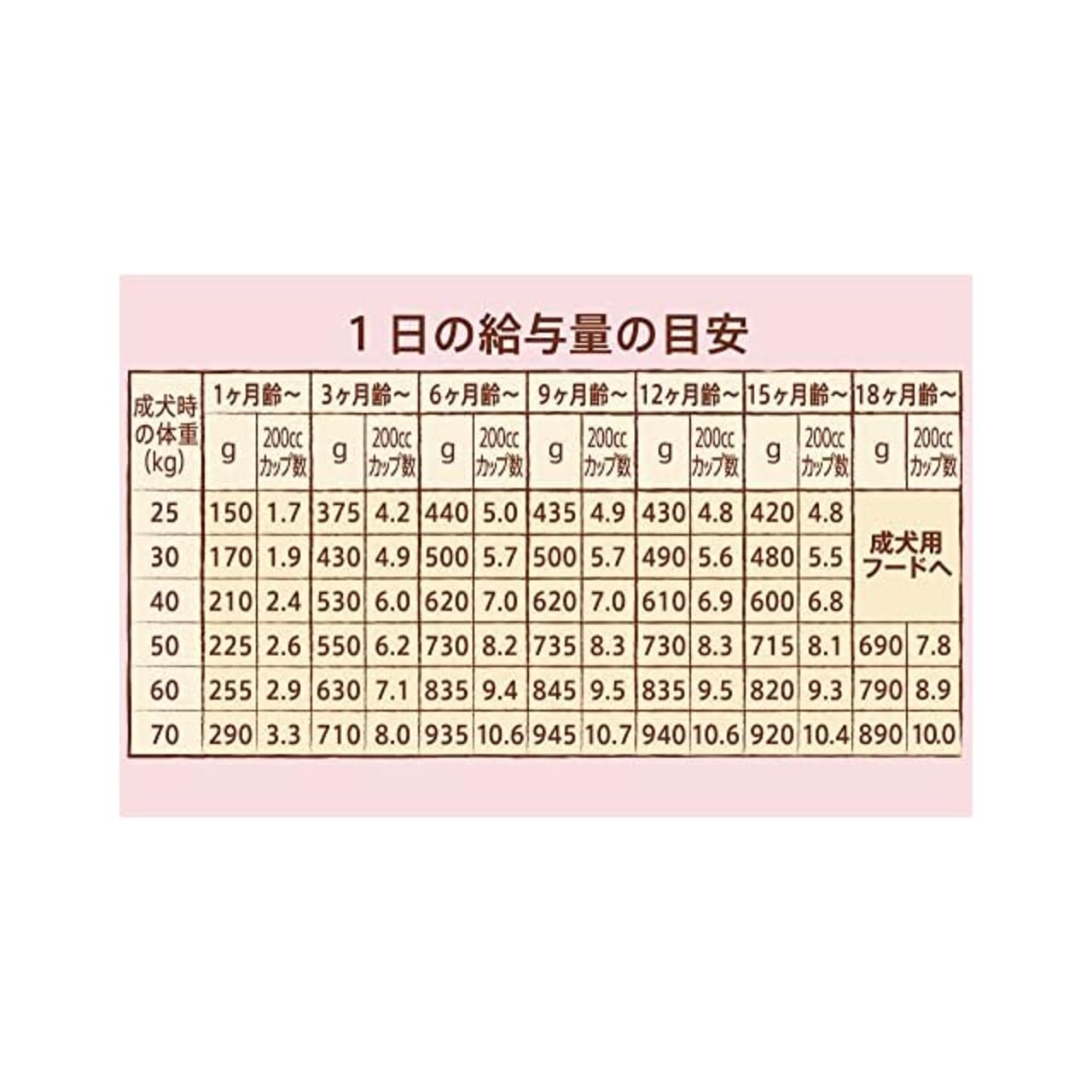 本品は、良質なタンパク質と脂質を調整し、子犬の健康な発育のために栄養バランスに配慮しています。また、ペットフード公正取引協議会の定める分析試験の結果、総合栄養食の基準を満たすことが証明されています。さらに、AAFCO(米国飼料検査官協会)規定の分析試験により、幼犬、妊娠犬、授乳犬の健康維持に適したバランスの良い総合栄養食であることが証明されています。
