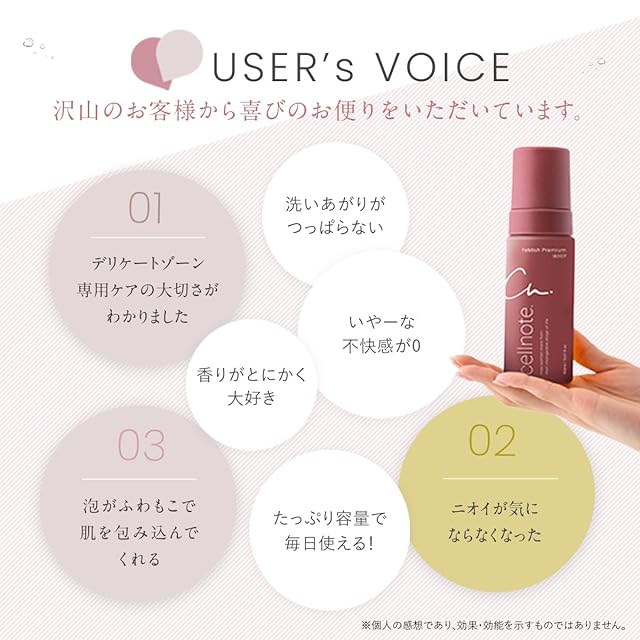 【 使い方 】①2~3 プッシュ分の泡を手に取ります。 ②デリケートゾーンを泡で優しく包み込むように洗う。 ➂ぬるま湯で洗い残しがないよう丁寧に洗い流す。